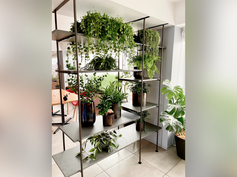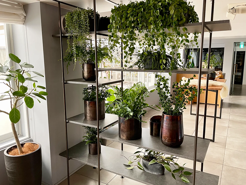 小鉢〜中鉢の綺麗な樹種の観葉植物を並べることで樹形の美しさを際立て、よりインテリア性の高いグリーン空間を演出いたしました。