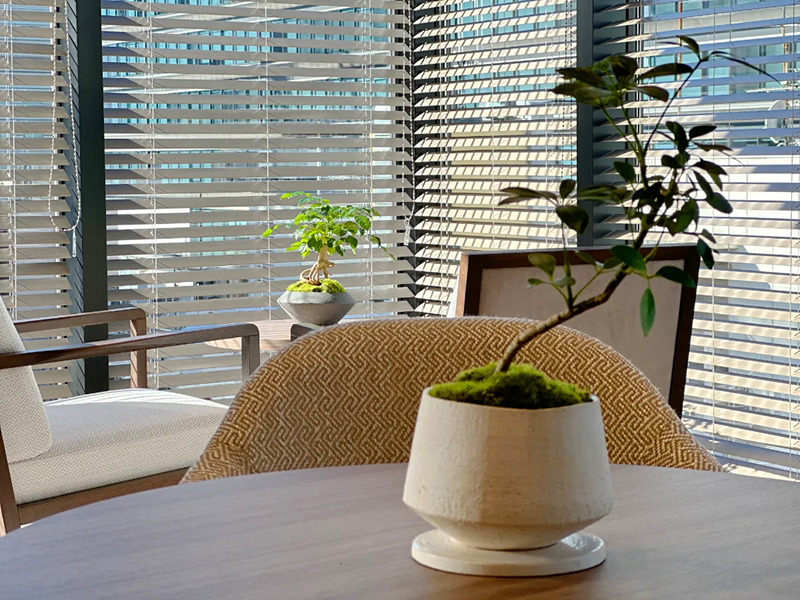 観葉植物は盆栽仕立てに仕上げた小鉢と寄せ植えの大鉢を配置し、印象的な空間をなるようグリーンで演出いたしました。