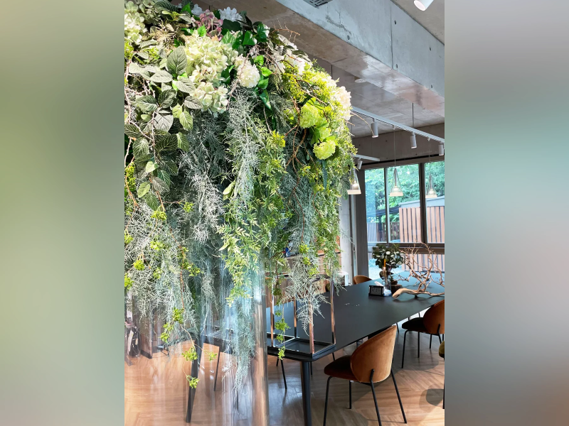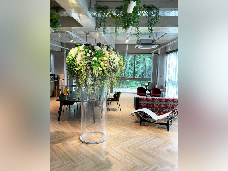 お客様が所有されるアクリルの筒を活かしてデザインを起こし、木の空間と周りのグリーンに馴染むようにナチュラルな色合いのフェイクグリーンとアーティフィシャルフラワーでアレンジを作製。