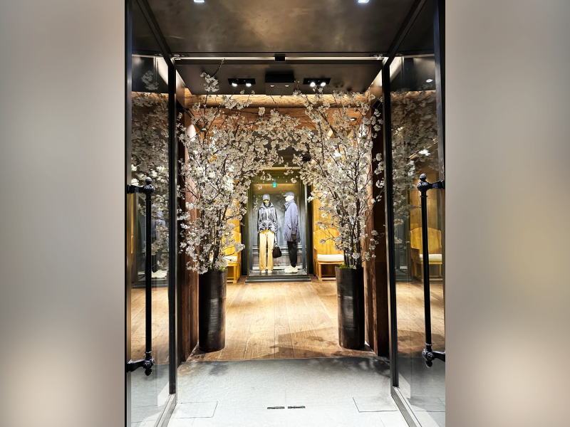 ショップのエントランスに桜をアーチ状に活け込みました。満開に咲いた桜が、店内に春の訪れをもたらす装飾です。