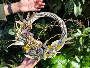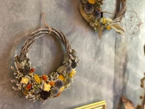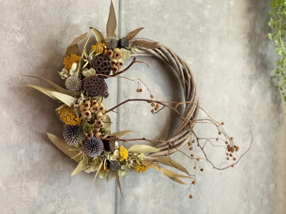 吉祥寺で行ったワークショップにて、ドライフラワーを使用したリースを制作しました。 リースというと、クリスマスのイメージが強いですが、花材を工夫するだけでお部屋の素敵なインテリアになります。