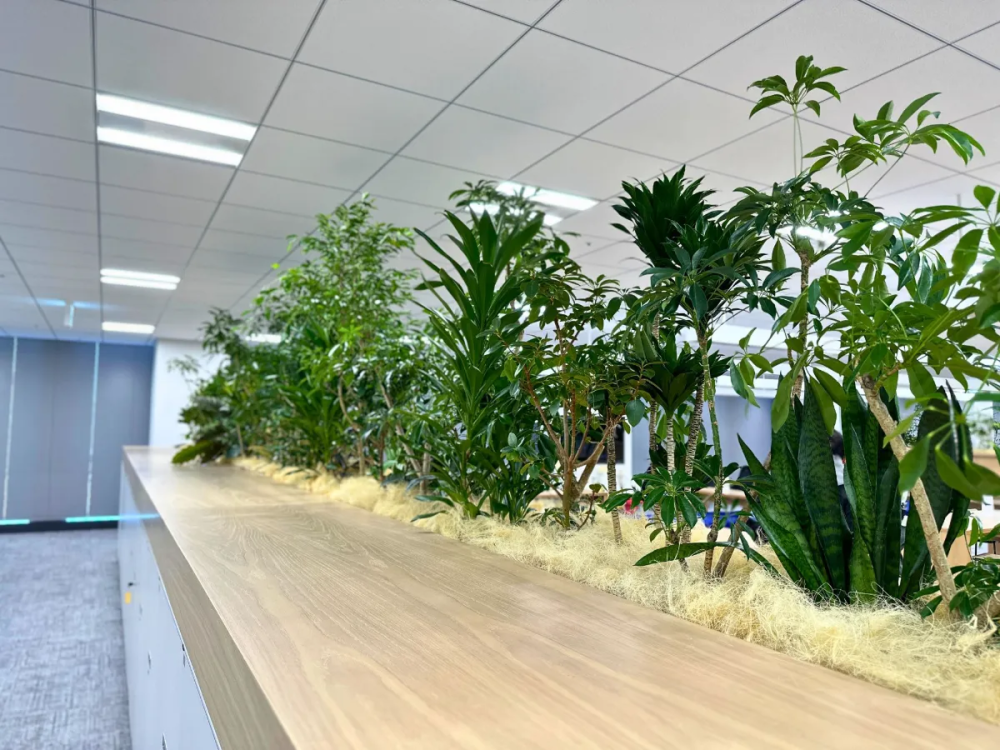 様々な種類の観葉植物を寄せ植えをして、スタイリッシュなナチュラル空間を演出しました。オフィスの中央に植栽帯があることで空間にメリハリをつけることができます。